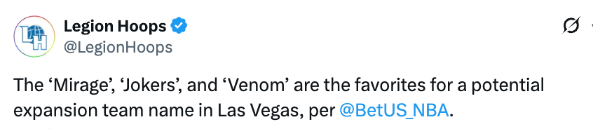 2026-04-05 01:30北京时间4月5日,据美媒账号BetUS NBA报道,“海市蜃楼(Mirage)”、“小丑(Jokers)” 和“毒液(Venom)”是拉斯维加斯潜在NBA扩军球队队名的热门候选。