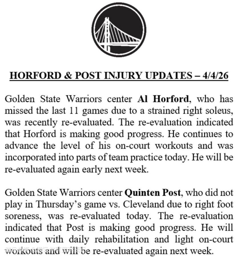 2026-04-05 06:30北京时间4月5日,勇士官方更新球队伤情公告,霍福德和波斯特接受复查,结果表明恢复进展良好。