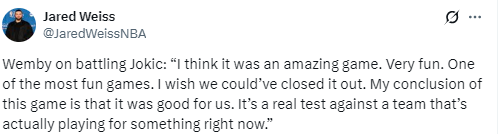 文班亚马在谈及与约基奇的对决时表示:“我认为这是一场无比精彩的比赛,非常有趣,算得上是最有趣的比赛之一。我真希望我们能拿下这场比赛。这场球对我们来说是很好的历练,面对一支如今真正为目标而战的球队,这是一次实打实的考验。”