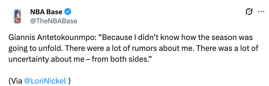 字母哥在接受采访时表示:“我不知道这个赛季会如何发展,关于我的流言满天飞,我和球队双方都充满了不确定性。”