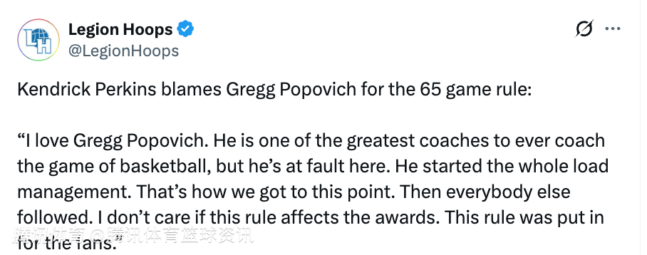 帕金斯:65场参赛规则门槛确实是波波维奇的锅 他开启了负荷管理先河