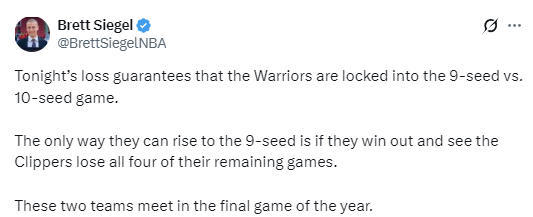 此役过后,勇士队的战绩为36胜42负,距离开拓者队和快船队都有4个胜场的差距,而开拓者队还要与快船队进行一场对决,所以他们之中至少会有一支球队取得41胜,这意味着勇士队不可能再升到西部第8。而勇士队在与开拓者队的常规赛交手中1胜2负处于下风,战绩持平也会排名西部第10,因此他们只有一种可能性升至西部第9,那就是超越快船队。