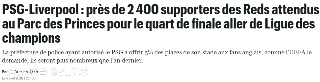 2026-04-06 14:30欧冠1/4决赛首回合的对决,利物浦做客面对大巴黎。根据《巴黎人报》的报道,此役巴黎方面将严格按照欧足联的规定,给利物浦球迷5%的球票份额,届时将有2367名利物浦球迷入场观赛,相比上赛季两队交手时,额外“放行”了376名红军拥趸。