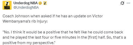 在谈到文班亚马的伤情时,约翰逊表示:“目前还没有他的伤情更新。不过他感觉自己能够重返赛场,并且在上半场最后四五分钟登场了,这一点是积极的。所以在我看来,这是个好迹象。”