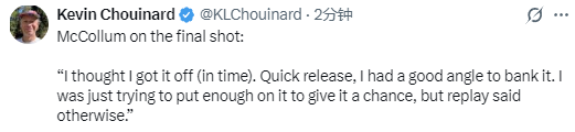 麦科勒姆说道:“我以为自己及时出手了。我的出手很快,而且我有不错的打板角度。我只是想发力足够,让球有机会进筐,但回放显示并非如此。”