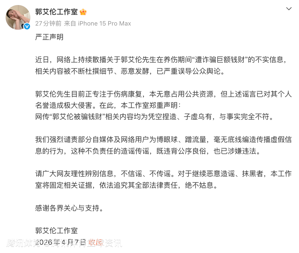 郭艾伦先生目前正专注于伤病康复,本无意占用公共资源,但上述谣言已对其个人名誉造成极大侵害。在此,本工作室郑重声明: