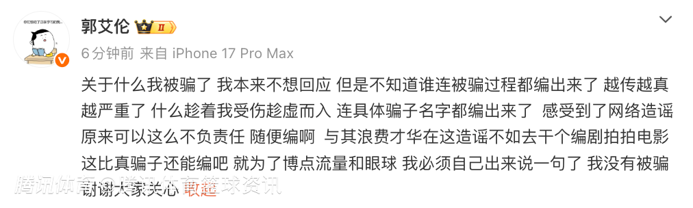 被骗纯属子虚乌有?郭艾伦社媒辟谣:我没有被骗 谢谢大家关心