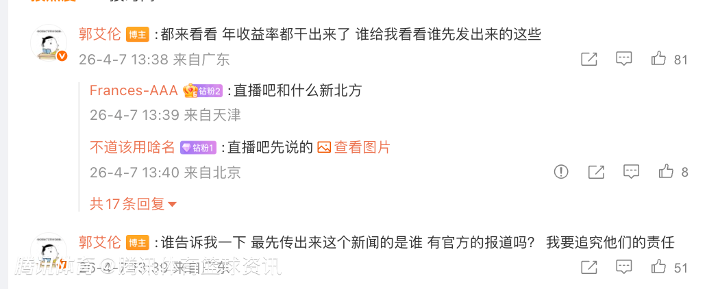 随后郭艾伦也在评论区写道:“都来看看,年收益率都干出来了,谁给我看看谁先发出来的这些”、“谁告诉我一下 最先传出来这个新闻的是谁 有官方的报道吗? 我要追究他们的责任”。