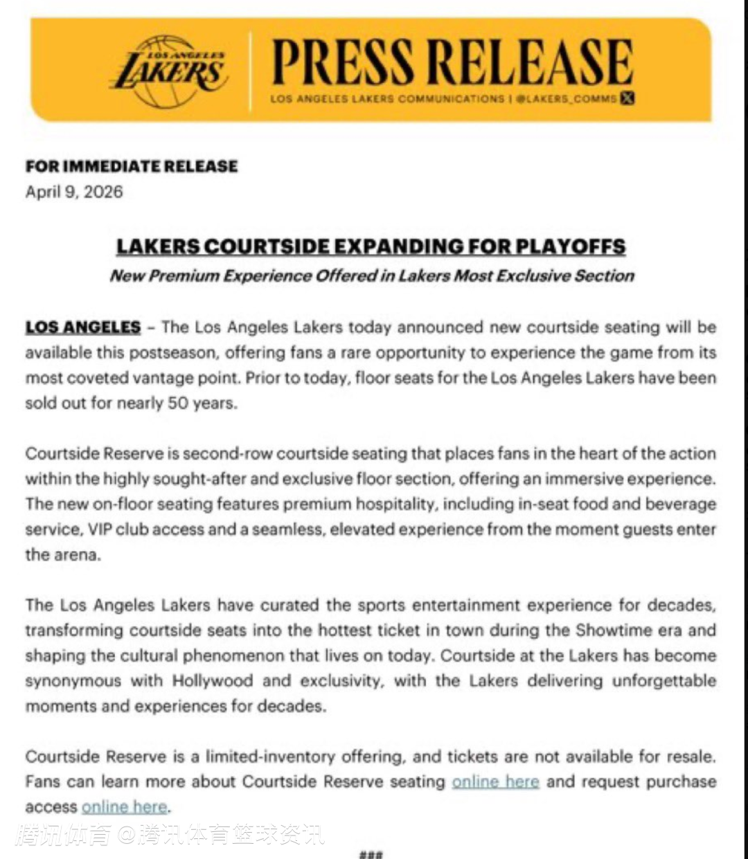 2026-04-10 00:20北京时间4月10日,湖人官方宣布,将在本赛季季后赛推出全新的场边观赛席位,为球迷提供从赛场最炙手可热的视角观赛的难得机会。在此之前,湖人的场边观赛席位已经近50 年保持售罄状态。