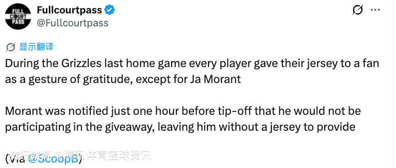 离队信号拉满?灰熊全员送球衣致谢球迷 莫兰特赛前1小时才接到通知不参与