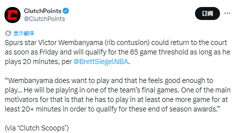 Siegel表示:“文班亚马本人确实想要出战,而且他感觉身体状态已经可以登场。他会在球队剩余的某一场常规赛里复出。其中一个主要原因是,他必须至少再打一场、且出场时间不少于20分钟,才有资格竞争本赛季的各项年度奖项。”