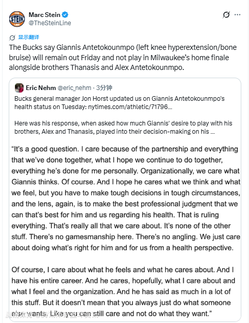 当被问及字母哥想和自己的兄弟亚历克斯、萨纳西斯并肩作战的意愿,在球队决策中占了多少分量时,霍斯特表示:“这是个好问题。我很在意这件事,因为我们之间的合作关系、我们一起走过的所有历程,以及我希望未来继续一同实现的目标,还有他个人为我所做的一切。从球队层面来说,我们当然在乎扬尼斯的想法。我也希望他同样在乎我们的想法和感受。”