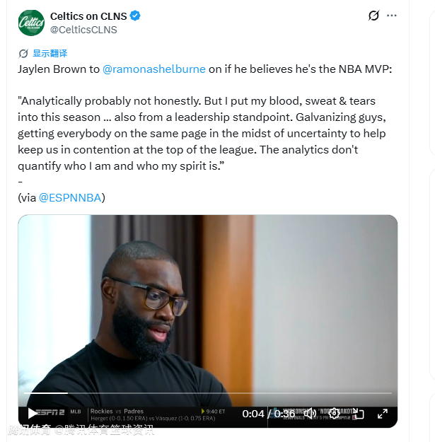 2026-04-10 06:40北京时间4月10日,凯尔特人球星杰伦-布朗在接受采访时,被问及是否认为自己是本赛季NBA常规赛MVP。