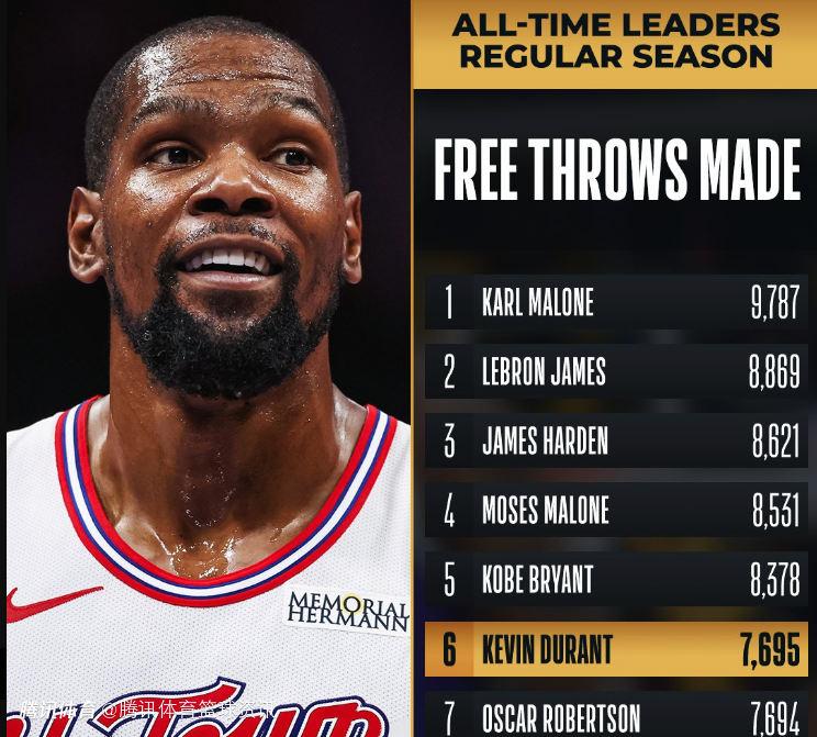 目前在杜兰特身前的球员是科比-布莱恩特,他在自己的常规赛生涯总计命中7695个罚球。排在这份榜单首位的球员是卡尔-马龙,他在自己的常规赛生涯总计命中9787个罚球。