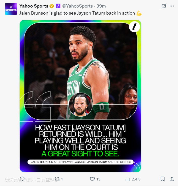 赛后布伦森的盛赞就算是唯一的安慰了,布伦森谈到塔图姆的复出:塔图姆恢复得这么快太不可思议了…… 看到他复出且打得这么好,真的太棒了。【这是塔图姆复出以来绿凯的第三场失利,实际上已经不算差】