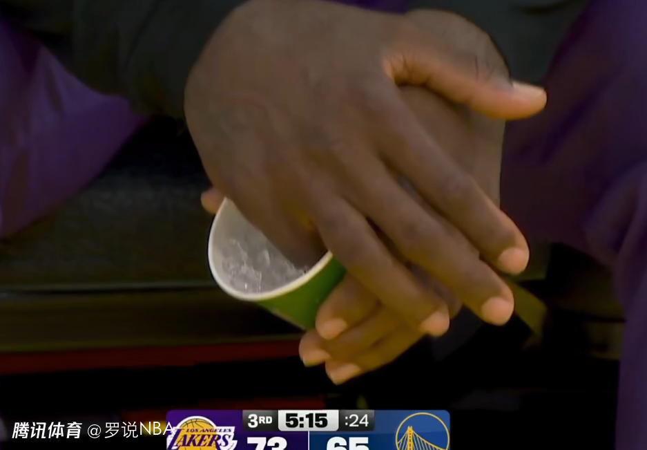 比赛第三节,詹姆斯飞身追帽,右手小指受伤。随后他返回场边进行冰敷治疗,很快又再次登场。