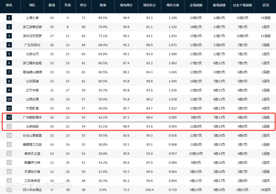 截止目前,北控男篮的战绩为16胜22负,排在积分榜第13位,与第12名的广州男篮相同的战绩,仍保留季后赛的希望。