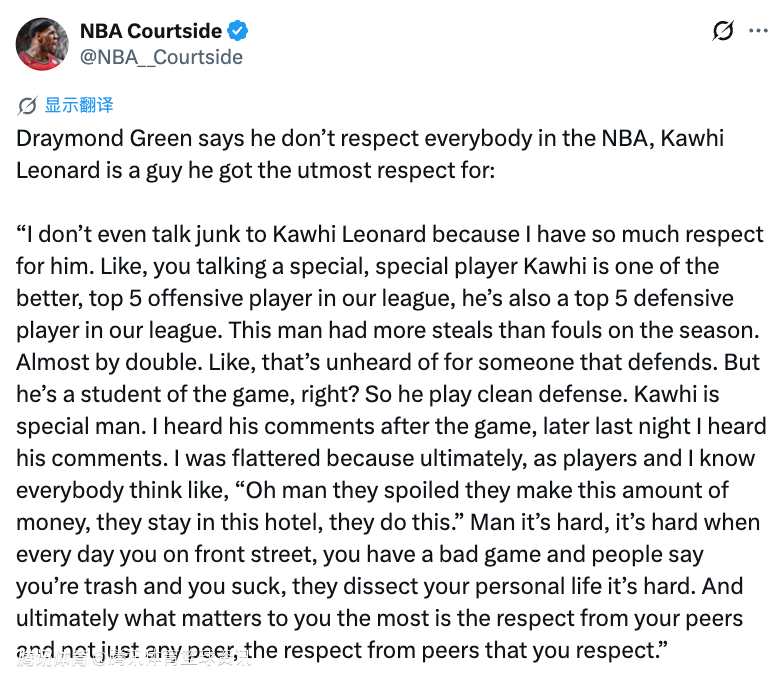 "他是真正懂球的人,对吧?所以他的防守动作一直很干净。科怀真的很特别。打完和快船的赛后我听到了他的发言,说实话我受宠若惊。因为说到底,我们都是球员,我知道大家总觉得‘他们拿这么多钱,住豪华酒店,日子过得多舒服’,但其实这行真的很难。每天都被推到风口浪尖,一场没打好就被骂‘垃圾’、‘废物’,私生活也被人扒得底朝天,真的太难了。到最后,真正能支撑你的,就是来自同行的尊重——而且不是随便谁的尊重,是你真正敬重的那些同行的尊重。”
