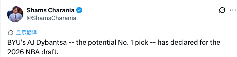 2026-04-24 00:00北京时间4月23日,据名记Shams报道,杨百翰大学球星AJ-迪班萨,潜在的状元秀已经宣布参加今年的NBA选秀大会。