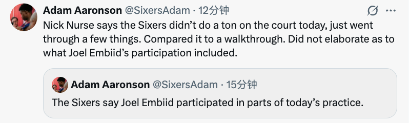 2026-04-24 01:20北京时间4月24日,据76人队记Adam Aaronson报道,76人方面表示,恩比德参与了今天训练的部分环节。