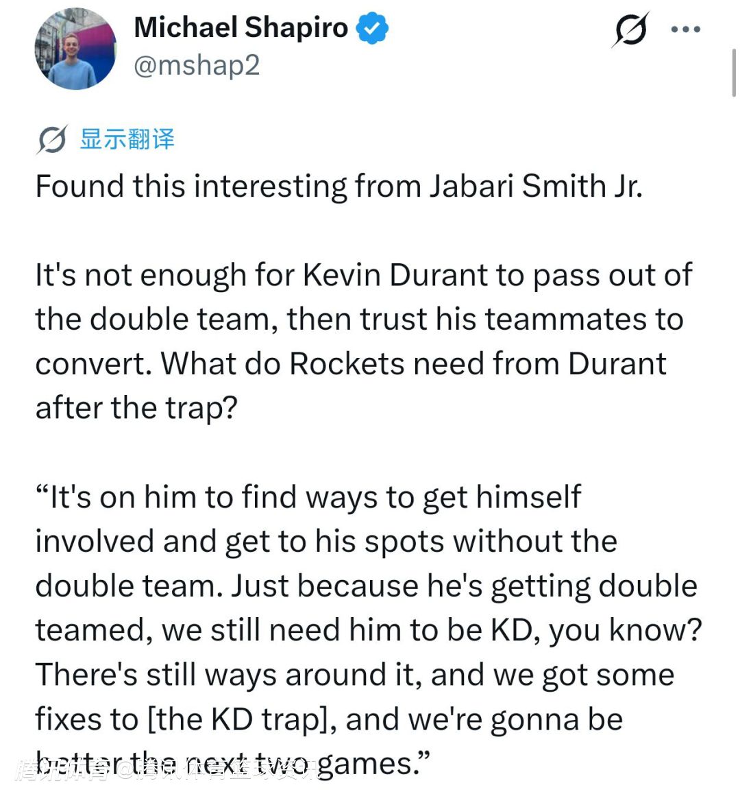 关于火箭如何在接下来的比赛应对杜兰特被包夹的情况,小贾巴里说道:“其他球员必须打得更有侵略性,我们整体都要更主动,做出正确的阅读和判断。他得自己想办法参与进攻,在不被包夹的情况下找到自己的进攻点位。就算他被包夹了,我们依然需要他打出杜兰特该有的水准。绕开包夹是有办法的,我们也会对针对杜兰特的包夹战术做出调整,接下来两场比赛,我们会做得更好。”