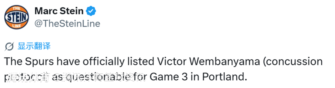 2026-04-24 08:40北京时间4月24日,据名记Stein报道,马刺队已正式将文班亚马(因处于脑震荡保护协议中)列为和开拓者系列赛G3的出战存疑球员。