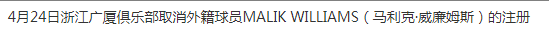 2026-04-24 16:50北京时间4月24日,CBA官方公布最新的外援注册信息,卫冕冠军广厦取消NBA旧将马利克-威廉姆斯的注册,重新注册总冠军外援卡尔顿,维持阵容的稳定性。