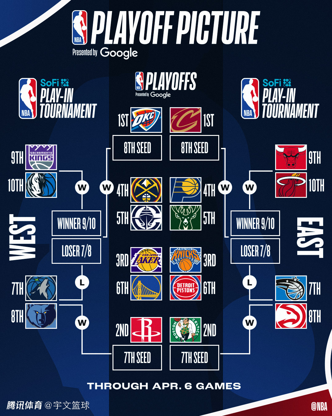 季后赛:勇士vs湖人、快船vs掘金,活塞vs尼克斯、雄鹿vs步行者,雷霆、火箭、骑士、凯尔特人待定