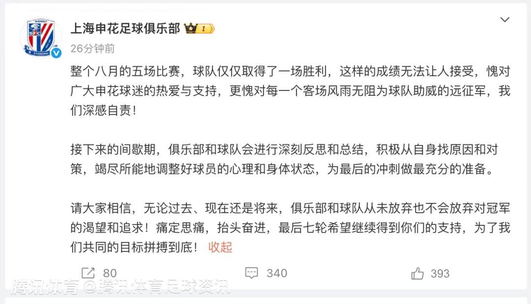 八月仅赢1场!申花致歉:深感自责 不会放弃对冠军的追求