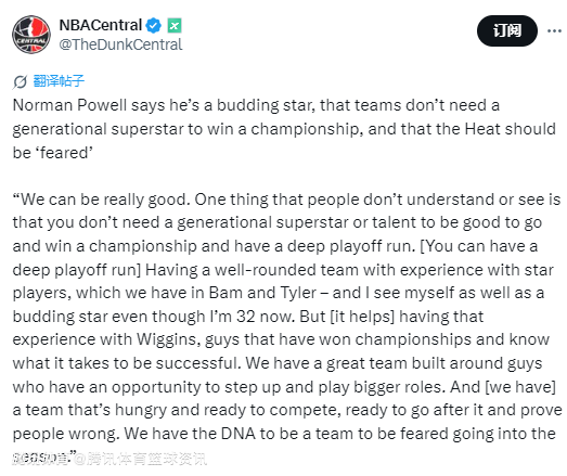 “阿德巴约和希罗都是这样的球员,而且即便我现在已经32岁了,我依然认为自己是一名正在崛起的潜力新星。此外,维金斯这样的球员也能为球队带来帮助,他们拥有夺冠经验,清楚要取得成功需要付出什么。我们的球队阵容构建得非常出色,队中的每位球员都有机会站出来,承担更重要的角色。而且我们这支球队充满渴望,已经做好了竞争的准备,随时愿意为目标全力以赴,证明那些不看好我们的人是错的。新赛季即将到来,我们这支球队拥有成为令人畏惧之师的基因。”