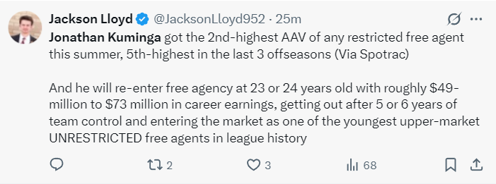 他将在23岁或24岁重新进入自由市场,届时他的职业生涯收入约为4900万-7300万(因为是两年合同,他可以选择不跳出或跳出),在球队拥有他的掌控权5-6年后,他将成为联盟历史上最年轻+不受限制的顶级自由球员之一。