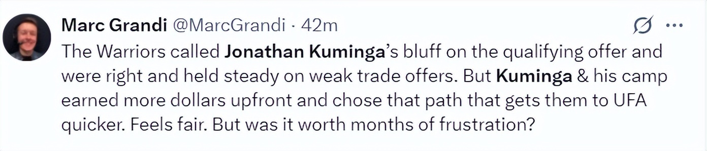 勇士记者马克-格瑞德写道:勇士队识破了乔纳森-库明加的虚张声势,拒绝了他想要球员选项的要求,并且在微不足道的交易报价中坚定立场。当然库明加也收获了相应的薪水,而且他可以更早的进入自由市场,这笔签约还算公平。但这几个月的拉扯真的值得吗?