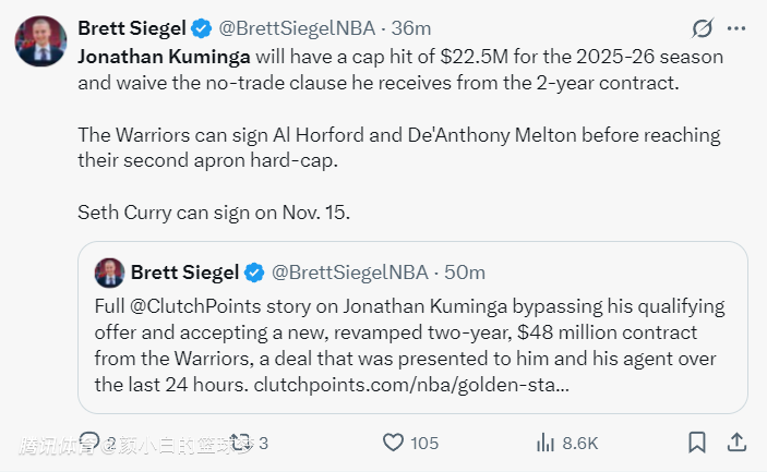 根据NBA记者Brett Siegel的解析:库明加25-26赛季的薪资为2250万,并且他将放弃这份为期两年合同中的交易否决权,勇士队可以在达到第二薪资上限之前签下霍福德与梅尔顿,赛思-库里可以在11月15日后签约。