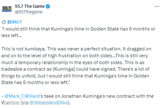 “事情并非一团和气,双方的处境从来都不算理想。这段分歧持续了太久太久,以至于双方都已陷入高度不满的状态。在双方眼中,目前的关系仍只是一种暂时的合作。库明加签下的这份合同,是他所能签下的最具交易可能性的合同类型之一。接下来还有很多事情会逐步展开,但我依然坚持我的判断:库明加在勇士队的时间,可能只剩下6个月或更短了。”