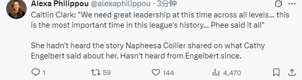 凯特琳-克拉克:支持科利尔的观点 WNBA总裁至今还未联系过我