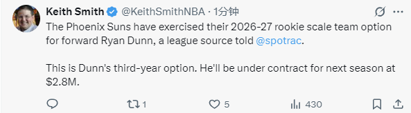 太阳已执行邓恩新秀合同第3年球队选项 下赛季薪资为280万美元