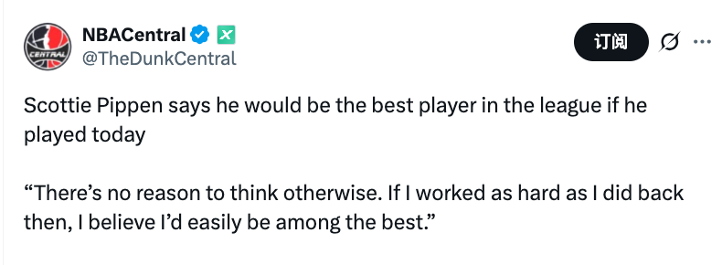 2025-10-05 23:40北京时间10月5日,近日,公牛名宿皮蓬在接受采访时表示,如果自己现在在联盟打球,会是最佳球员。