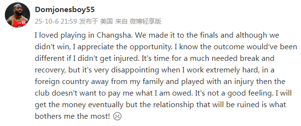 2025-10-07 07:00常年在CBA打球的外援琼斯今夏代表NBL俱乐部湖南队出战。但琼斯表示,湖南队至今还拖欠他的薪水。
