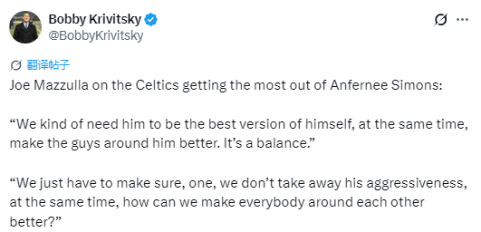 关于球队如何充分发挥安芬尼-西蒙斯的作用,马祖拉表示:“我们一方面需要他拿出自己的最佳状态,另一方面,也需要他带动身边的队友变得更好。这需要找到一个平衡。”
