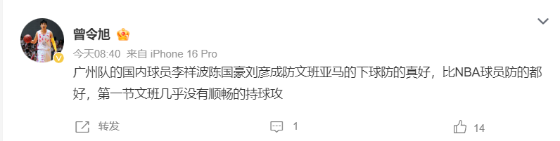 广东媒体人麦穗丰:最令人惊喜的就是陈国豪,22分钟里拿到14分3篮板成为本场唯一上双的本土球员,比赛中陈国豪充分展现自己的特点,预判篮板落点、禁区对抗、外线远投均有收获,无可挑剔的表现。