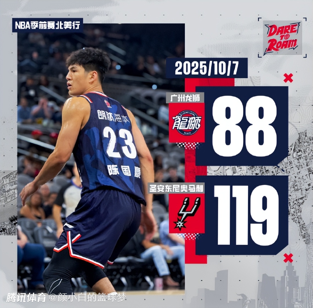 2025-10-07 12:30北京时间10月7日,NBA季前赛,广州男篮88-119惨败马刺队,这场季前赛马刺队不是全主力出战,福克斯、索汉、卡斯尔、奥利尼克、瓦塞尔、哈珀等人都没有出战,文班亚马也只打了16分钟,可CBA级别的球队跟NBA级别的球队火拼差距还是太大,广州最大的亮点就是陈国豪。