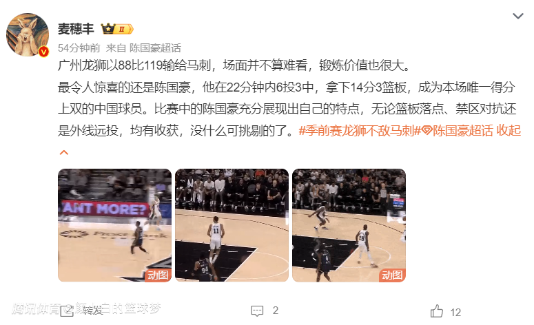 550万贵吗?陈国豪战马刺单节10分+下半场14分 媒体人:无可挑剔
