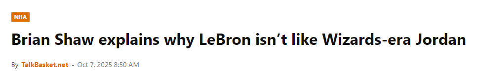 2025-10-07 22:50北京时间10月7日,前NBA球员兼教练布莱恩-肖不认同将詹姆斯目前在湖人队的阶段,与乔丹在奇才队的最后几年进行比较,称这两种情况完全不同。