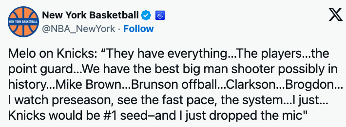 随后,甜瓜继续说道:“我认为尼克斯今年有了迈克-布朗,让布伦森打无球,再加上克拉克森和布罗格登,布罗格登能从替补席上为球队注入活力,布朗带来了不同的能量。我看了他们的季前赛,我看到了他们快速的比赛节奏,看到了他们的战术体系,我只是相信尼克斯会成为东部第一,我话就说到这。”