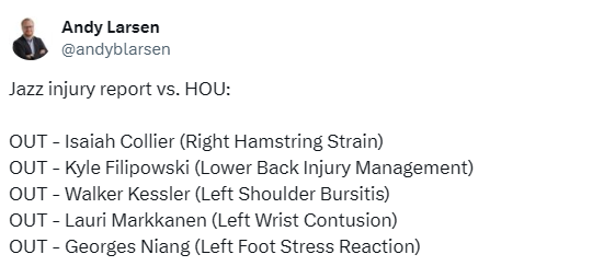 高挂免战牌!爵士官方:马尔卡宁等5人因伤缺席对阵火箭