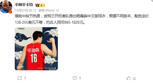 该记者指出,休赛期开拓者队周边商品销售额同比增长达到了惊人的813%,其中杨瀚森的16号球衣成为了“人手必备的爆款单品”。