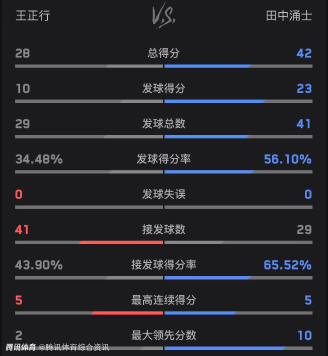 双方技术统计如下(王正行在前):总得分28-42、发球得分10-23、发球得分率34.48%-56.10%。