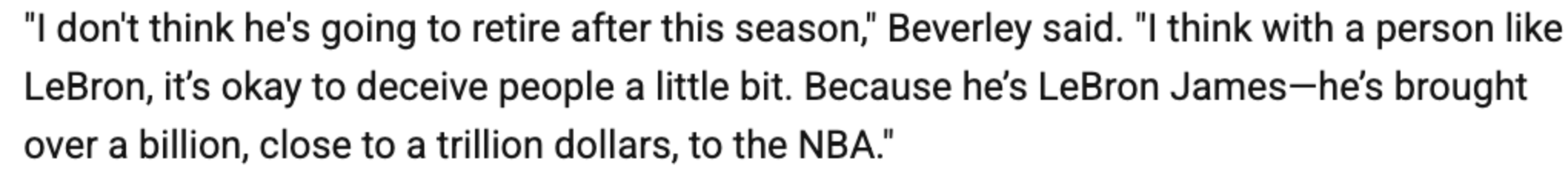 随后贝弗利也表示,本赛季不会是詹姆斯的最后一个赛季:“我不觉得他会在本赛季结束后退役,像勒布朗这样的人,稍微‘迷惑’一下大家也没什么。毕竟他是勒布朗-詹姆斯,他为NBA带来了超过10亿美元、甚至接近1万亿美元的价值。”