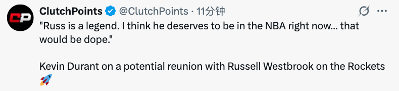 “不过话说回来,威少可是个传奇人物。我觉得他现在就该留在NBA,也值得能以自己的方式告别NBA,或是结束这个赛季。所以如果能实现的话,确实会很棒。但这不是我能决定的,真的不是我能说了算的。还是把这件事交给负责做这些决策的人吧。”
