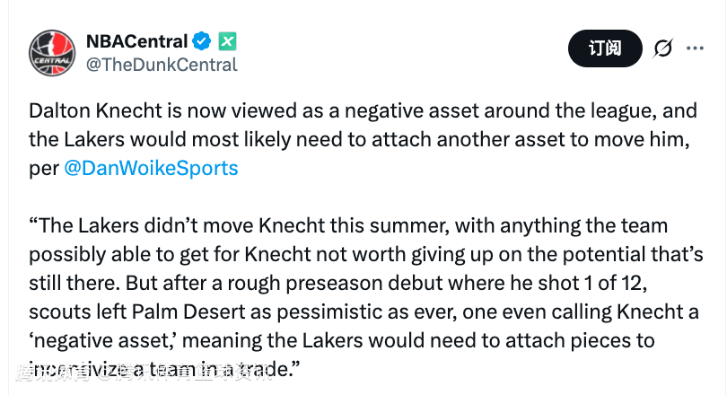 Dan Woike表示,湖人今年夏天没有交易克内克特,因为球队觉得能从他身上得到的回报,不值当放弃他仍存在的潜力。但在他季前赛首秀12投1中表现拉胯后,球探们离开棕榈沙漠时的悲观情绪达到了顶点,甚至有人称克内克特是“负资产”,这意味着湖人若要交易他,需要附加其他筹码来吸引球队。